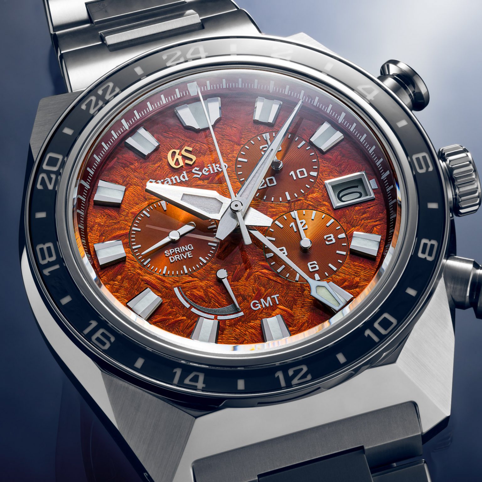 The new chronograph GMT is powered by Grand Seiko’s Caliber 9R96 movement, a specially adjusted version of Caliber 9R86 created to achieve a heightened accuracy of ±10 seconds per month compared to the ±15 seconds per month of Caliber 9R86.